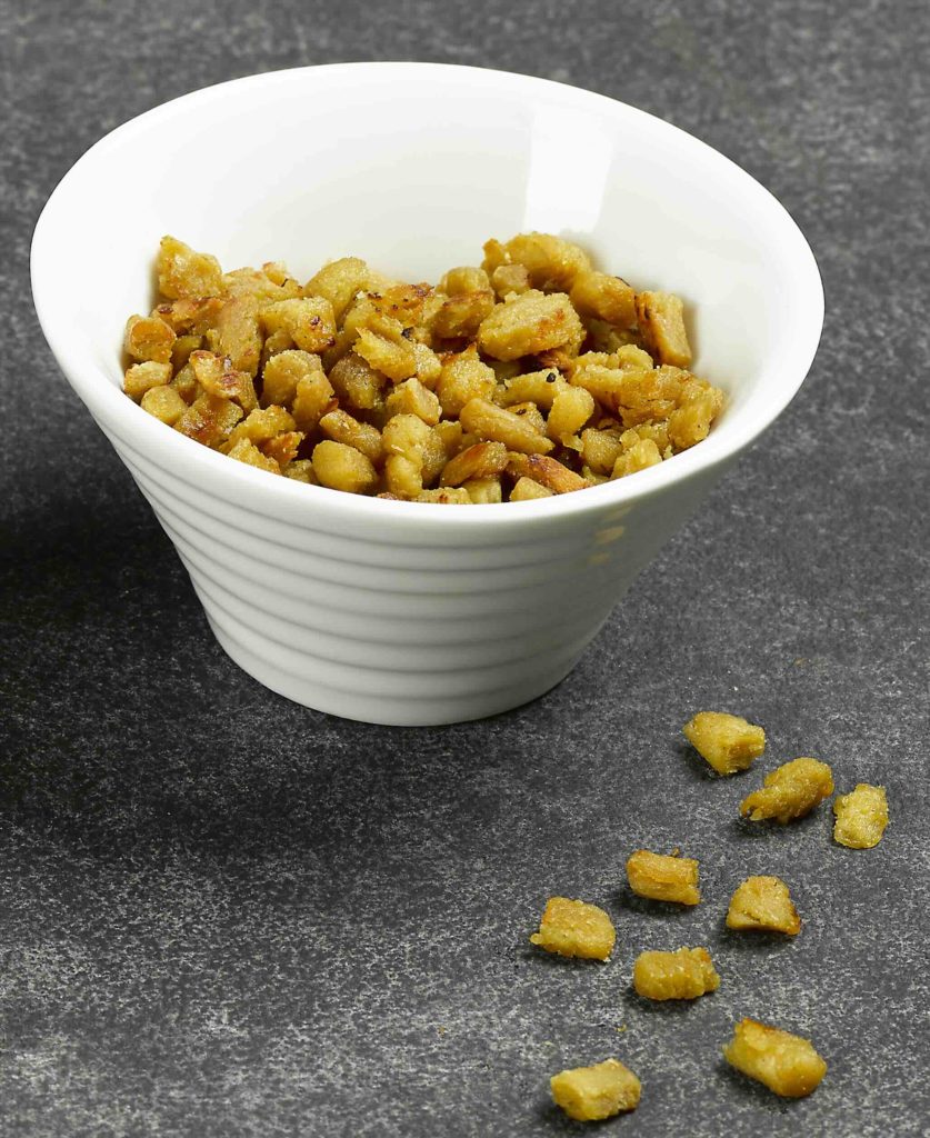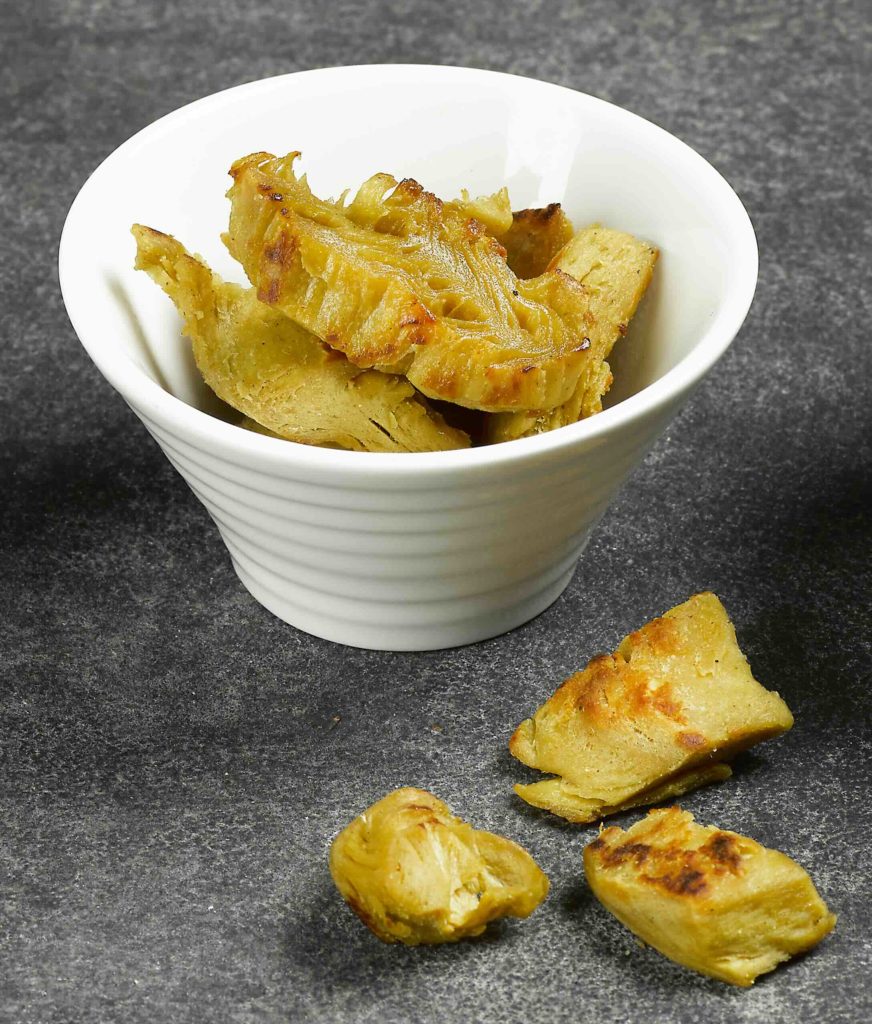 Vegan pieces, made in Switzerland from Swiss malt spent grain and Swiss pea protein. High in protein and fibre, low in fat. Fibrous texture, ideal for meatless preparation of dishes such as Stroganoff and curries.