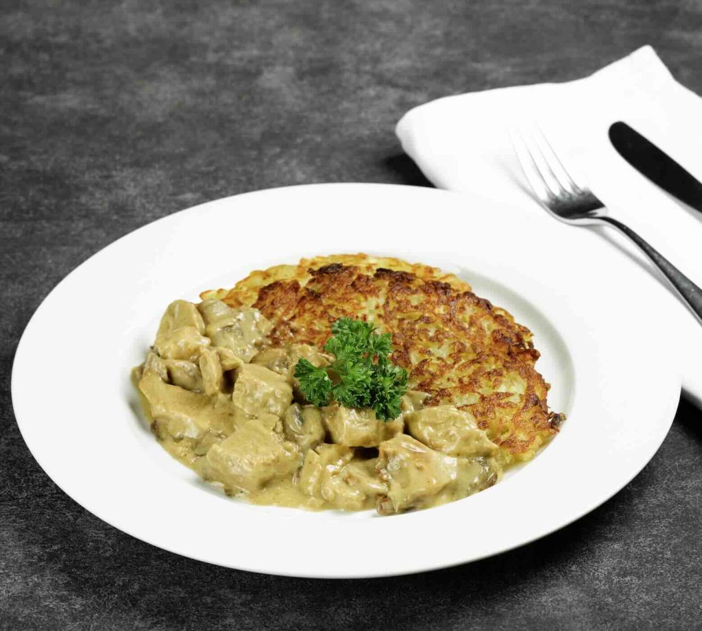Juicy Brewer’s chunks in creamy mushroom sauce. The perfect meat-free alternative to Zurich-style Stroganoff.